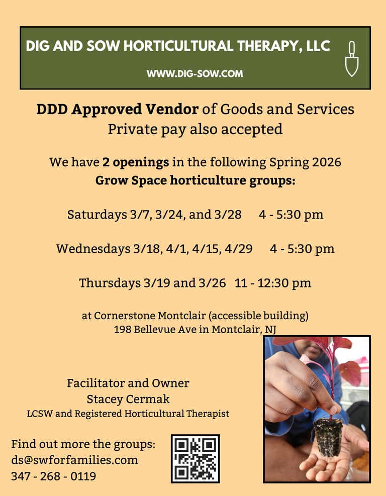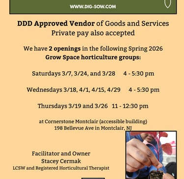 Dig and Sow Horticultural Therapy, LLC is owned by Stacey Cermak, LCSW, HTR.